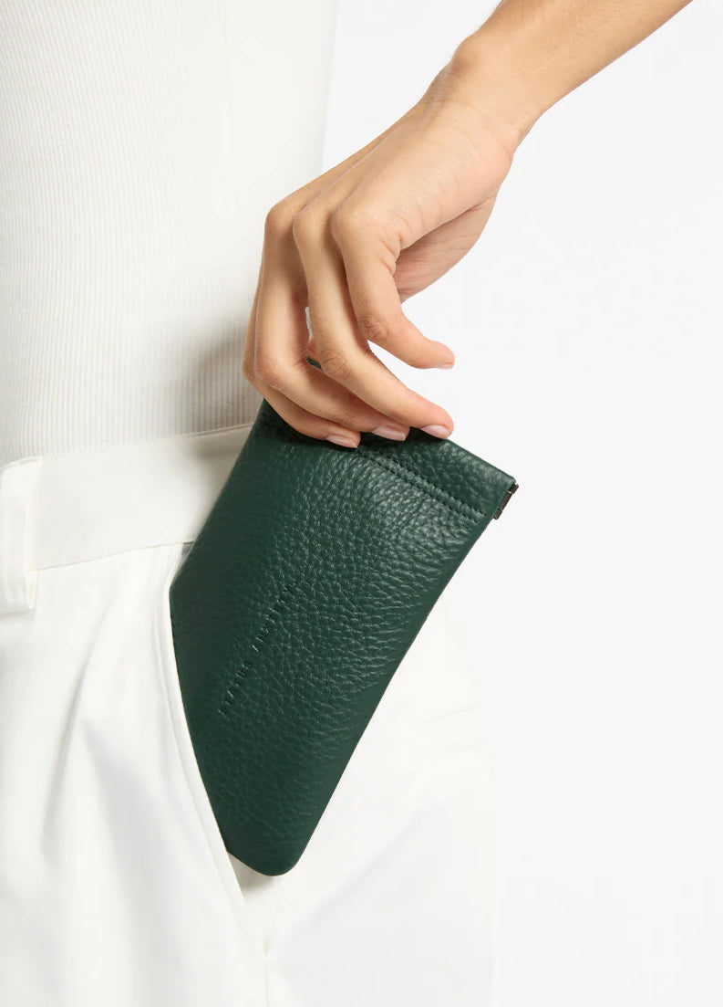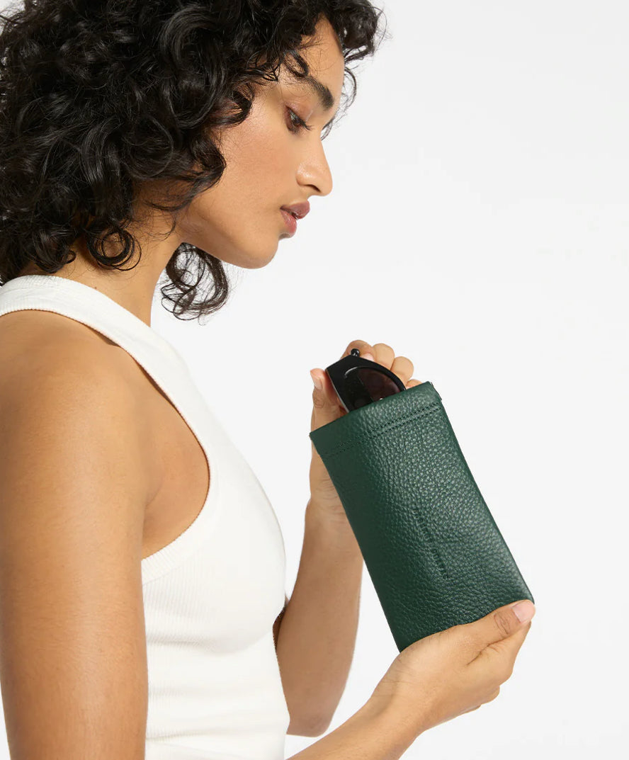 Likely to grow in its intrinsic value over time, the Keepsake sunglasses pouch is made using reclaimed leather offcuts from our handbag product. Waste not want not. Soft shrunken pebble leather Soft to touch black lining Pinch open top Keeps your sunnies safe from scratching, sand, dirt and provides some impact protection.